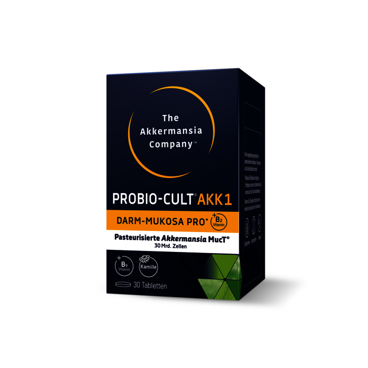 Eine intakte Darmschleimhaut ist die Grundlage für eine gesunde Darmflora. Nur ProBio-Cult®AKK1 enthält 30 Milliarden Zellen pasteurisierte Akkermansia MucT® pro Tablette und ist erstmalig und exklusiv in Österreich erhältlich. In jeder Tablette ist zusätzlich Riboflavin zur Unterstützung der Darmschleimhaut1 sowie für die Zellteilung wichtige Folsäure2 enthalten.
